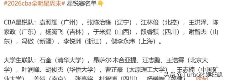 CBA星锐队的完整名单包括袁照耀(广州)、张陈治锋(辽宁)、江林俊(北控)、王洪泽、陈家政(广东)、杨腾飞(吉林)、于米提(山西)、段睿骐(四川)、谢智杰(山东)、冯傲(新疆)、李悦洲(浙江)、偰李永炜(上海)。 这份名单覆盖了联盟中多支球队的年轻核心,其中二年级球员6人,一年级球员10人,展现了CBA新生代球员的构成。